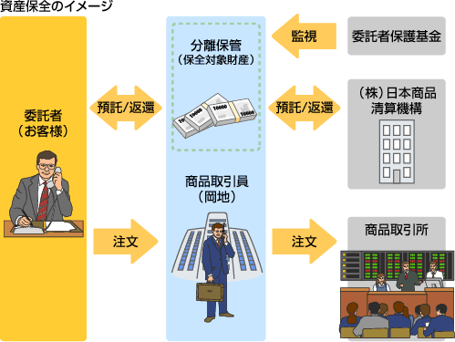 また、商品取引員が清算機構に預託するまで、あるいはお客様に返還するまで等のご資金については、保全対象財産として分離保管措置を講じ、資産の保全を図っております。 |