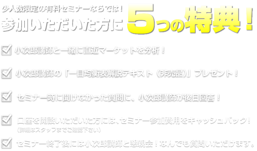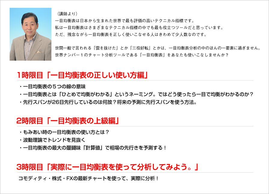 今回のセミナーでは「一目均衡表」の基礎から実践的な活用術までを1日で学ぶことができます。
